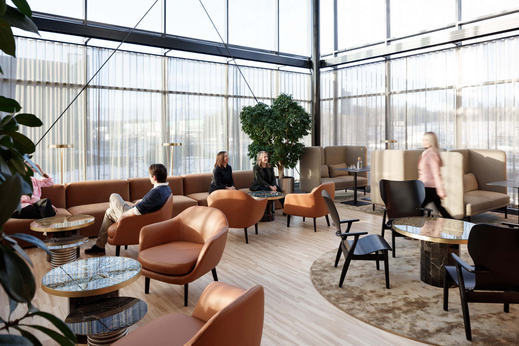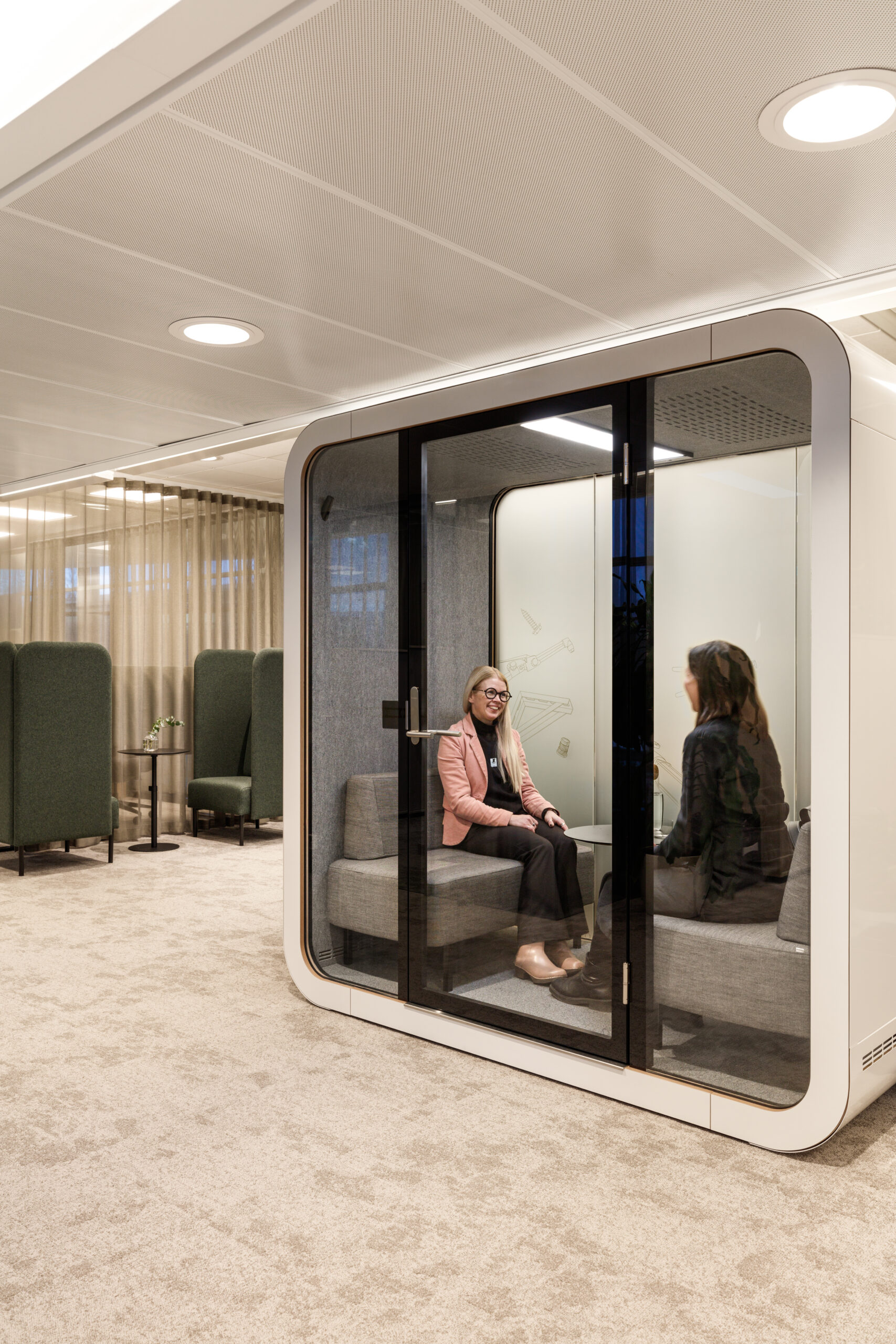 The new space was designed to feel both elegant and welcoming – warm materials, natural tones, and considered lighting and acoustics all contribute to a carefully curated work atmosphere that supports everyday tasks as well as moments of focus and collaboration.