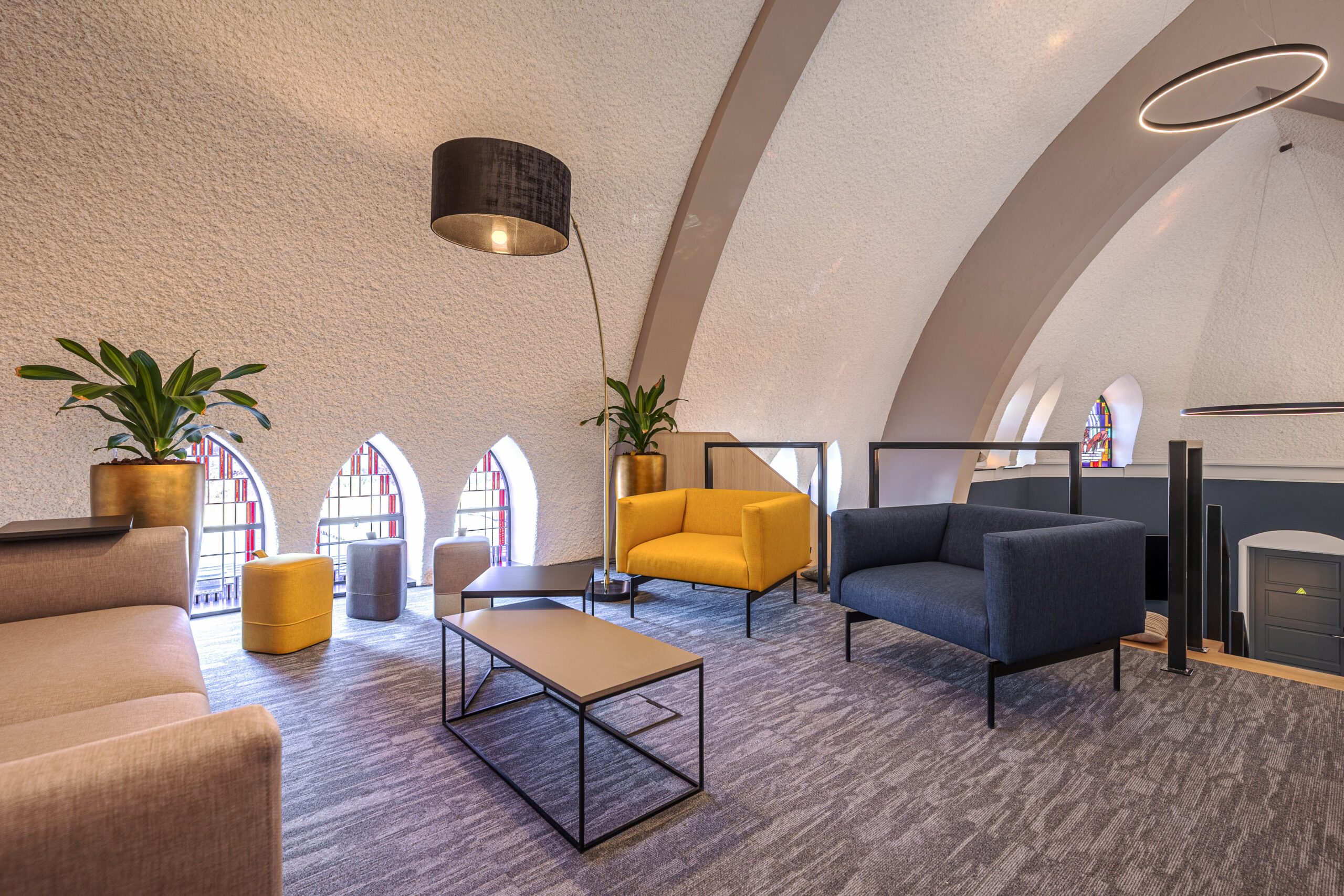 Designed to serve multiple functions within the Savant Zorg organization, the chapel now accommodates a meeting room, flexible workstations, and a stand for presentations and workshops. A mezzanine has been transformed into an informal meeting area, enhancing the versatility of the space.