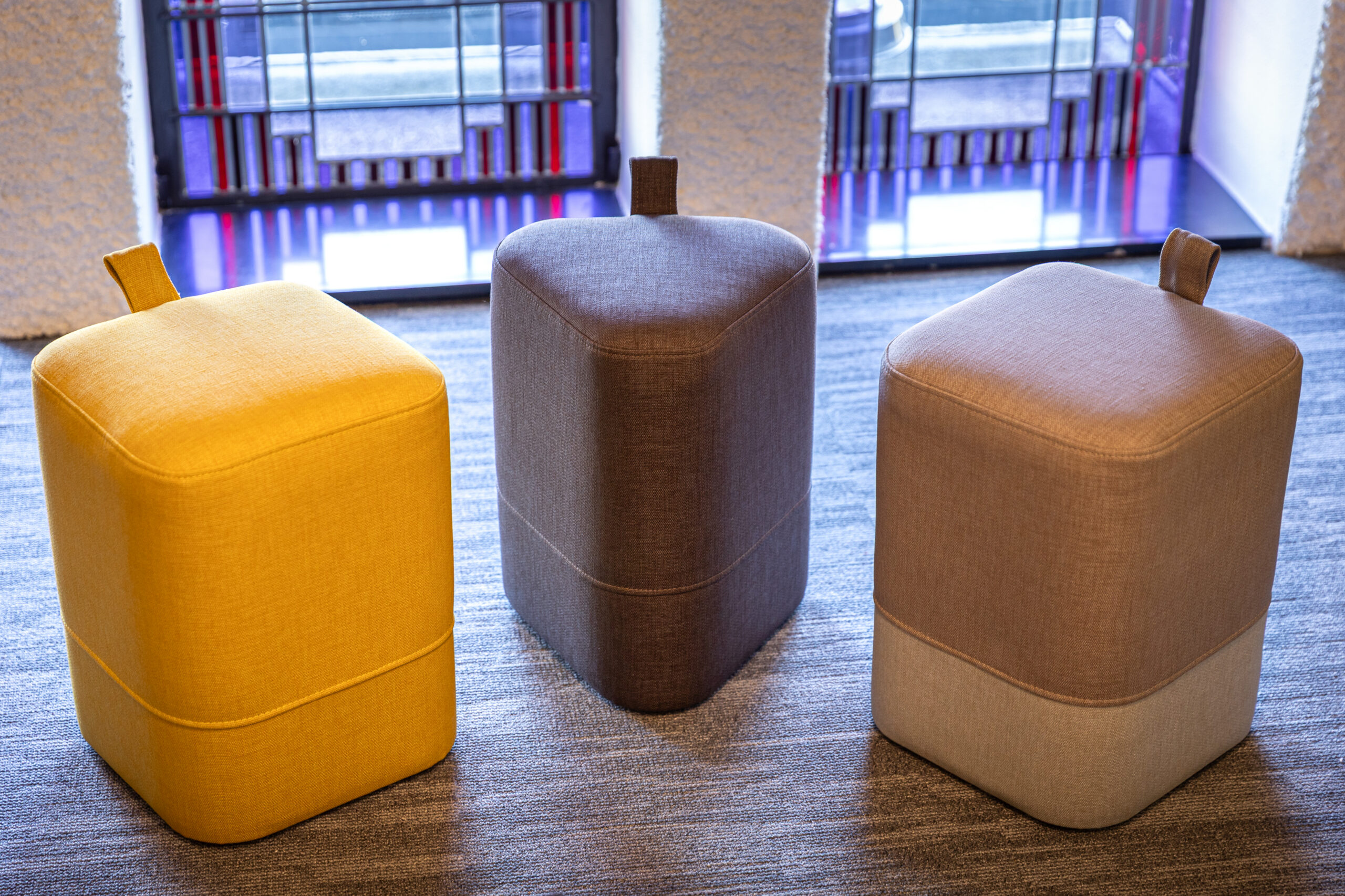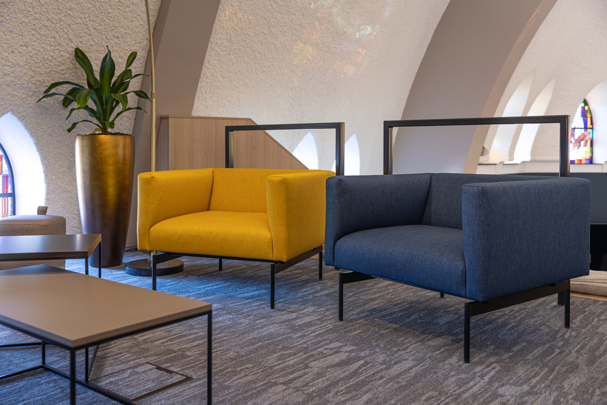 The Sans sofas provide an aesthetically pleasing and comfortable seating arrangement that aligns with the chapel’s architectural features. Adjacent to these, the Duo and Twin poufs offer flexible seating options that can be easily adjusted to accommodate larger groups, ensuring the area remains adaptable and user-friendly.