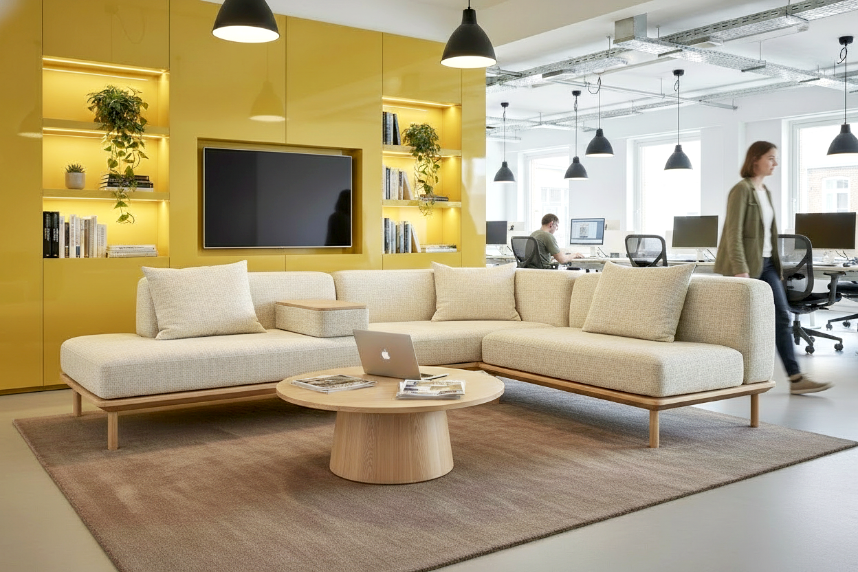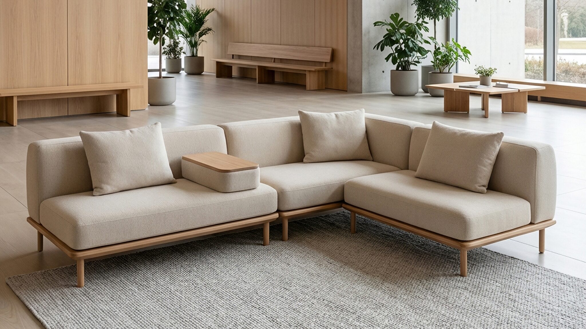 Thanks to its modular structure, Kimi can be configured into sofa compositions that suit a variety of spaces — from reception areas and lounges to quieter meeting and conversation zones. A practical movable armrest/table is available as an accessory: one side functions as a comfortable support to lean against, while the other provides a solid surface for a coffee cup, laptop or notebook. Decorative cushions can also be added to enhance back support and overall comfort.