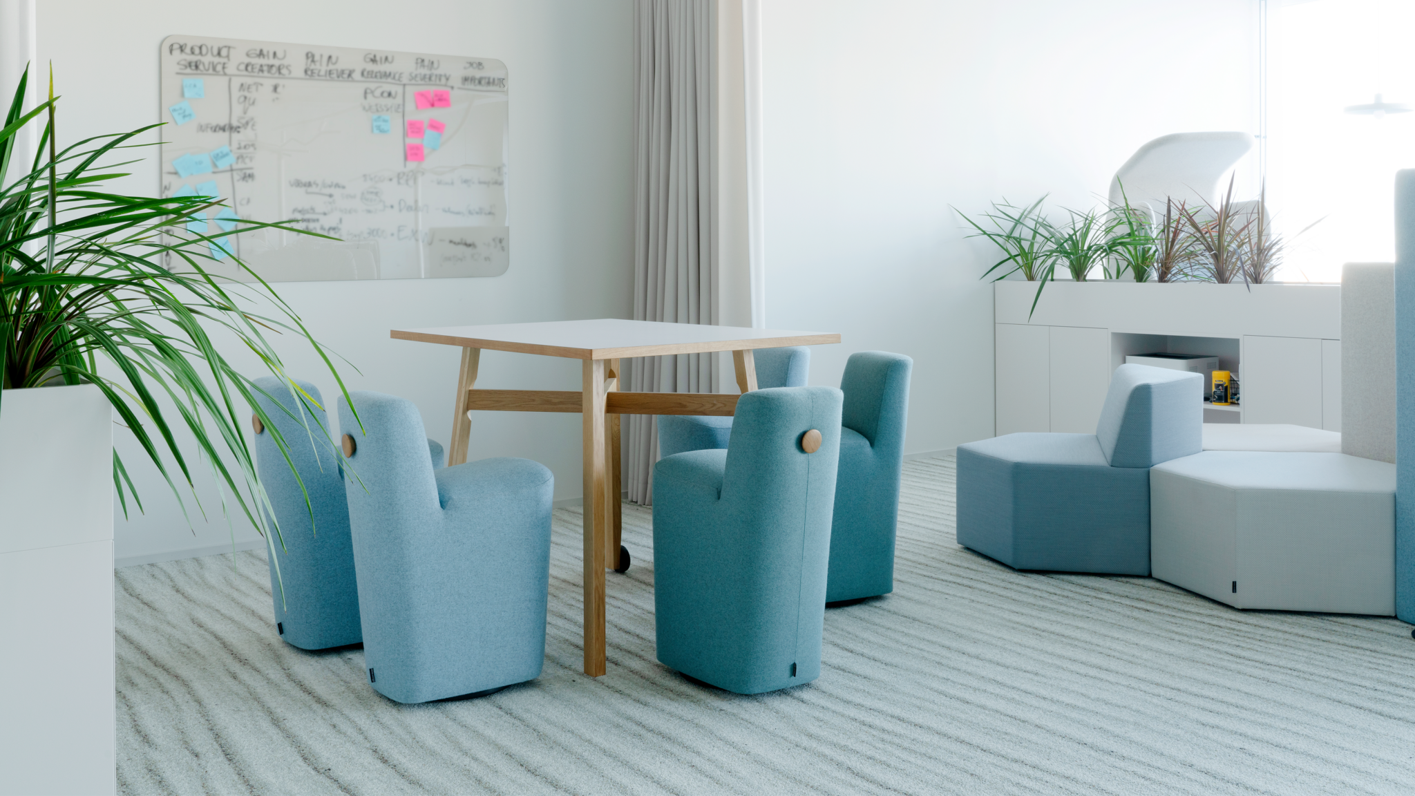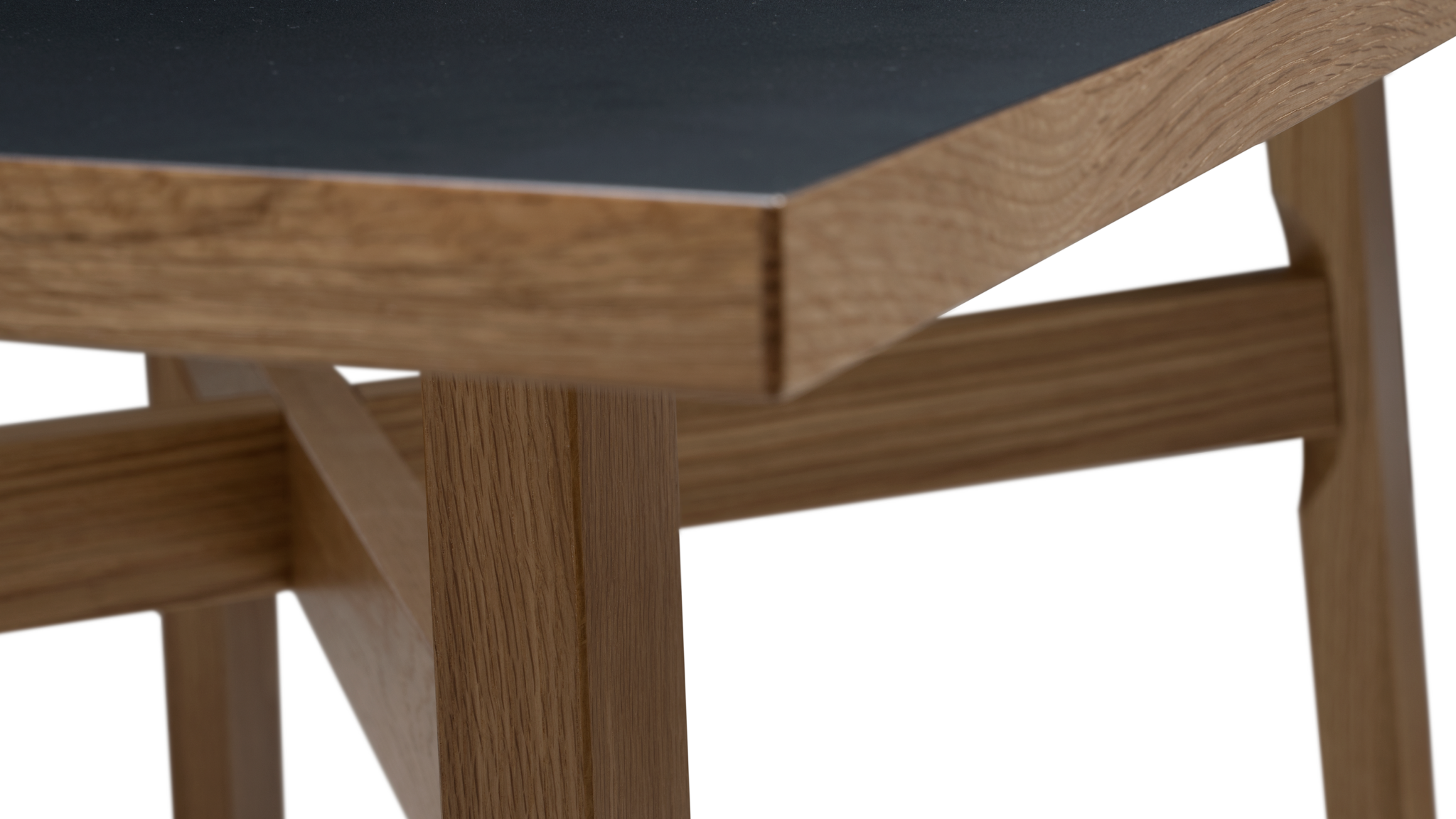 A table for flexible collaboration. Designed for ease of movement with its attached wheels and sturdy oak frame, with a height that makes stand-up meetings a breeze. Use these on their own, or push them together to create different configurations.