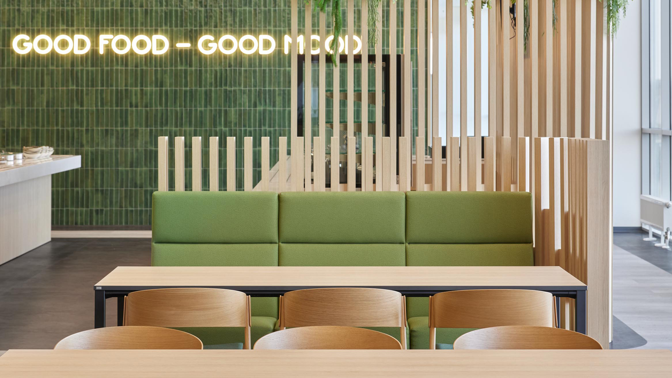 A long table for a bigger group serves as the centerpiece for joint team lunches and team-building events, fostering a sense of community and collaboration.